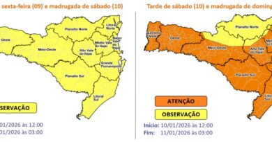 Entre esta segunda (07) e a terça-feira (08), o tempo volta a ficar instável em Santa Catarina, com condições para temporais isolados e chuva pontualmente intensa em curto período de tempo. Os temporais vem acompanhados por raios, rajadas de vento e eventual queda de granizo. O risco é moderado, nas áreas em amarelo do mapa, para ocorrências associadas a alagamentos e enxurradas pontuais, destelhamentos e danos na rede elétrica. Nas áreas em verde o risco é baixo.