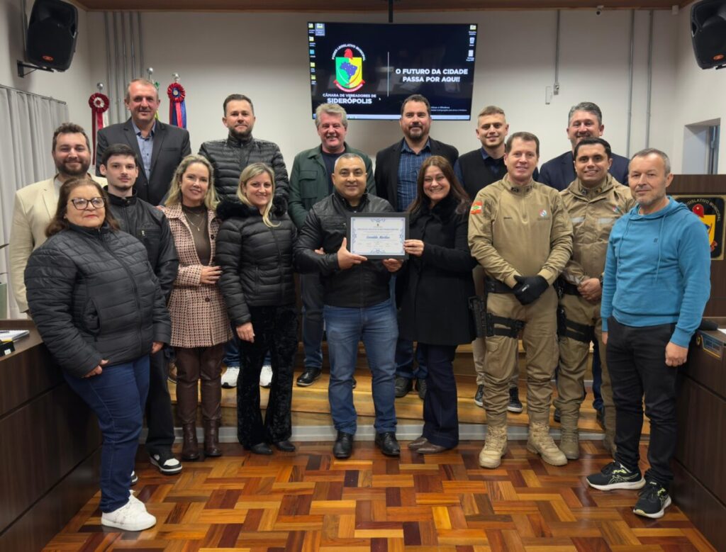 A sessão ordinária da Câmara de Vereadores de Siderópolis desta segunda-feira, dia 30, foi marcada por um momento de reconhecimento e emoção. O 2º Sargento da Polícia Militar Everaldo Martins recebeu uma Moção de Aplausos e Reconhecimento pelos seus 30 anos de dedicação ao serviço público, em especial ao município de Siderópolis. A homenagem foi proposta pela vereadora Jadna Rodrigues (PSD) e contou com a assinatura de todos os parlamentares da Casa.