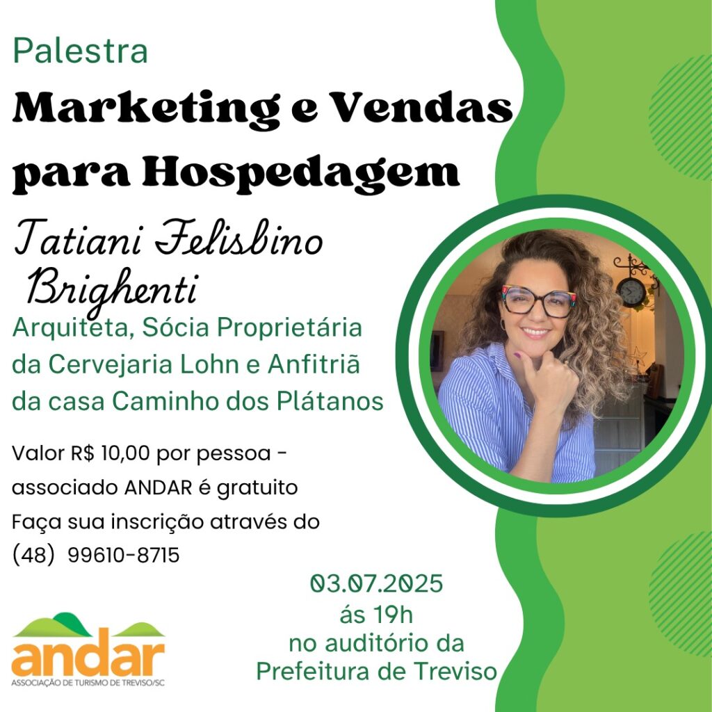 Empreendedores do setor de turismo e hospitalidade de Treviso e região terão uma oportunidade única para aprimorar seus conhecimentos e estratégias de vendas. A Associação de Turismo de Treviso (Andar) promove, nesta quinta-feira, dia 3, a palestra “Como atrair mais clientes e vender melhor no seu negócio de hospedagem”, com a especialista Tatiani Felisbino Brighenti.