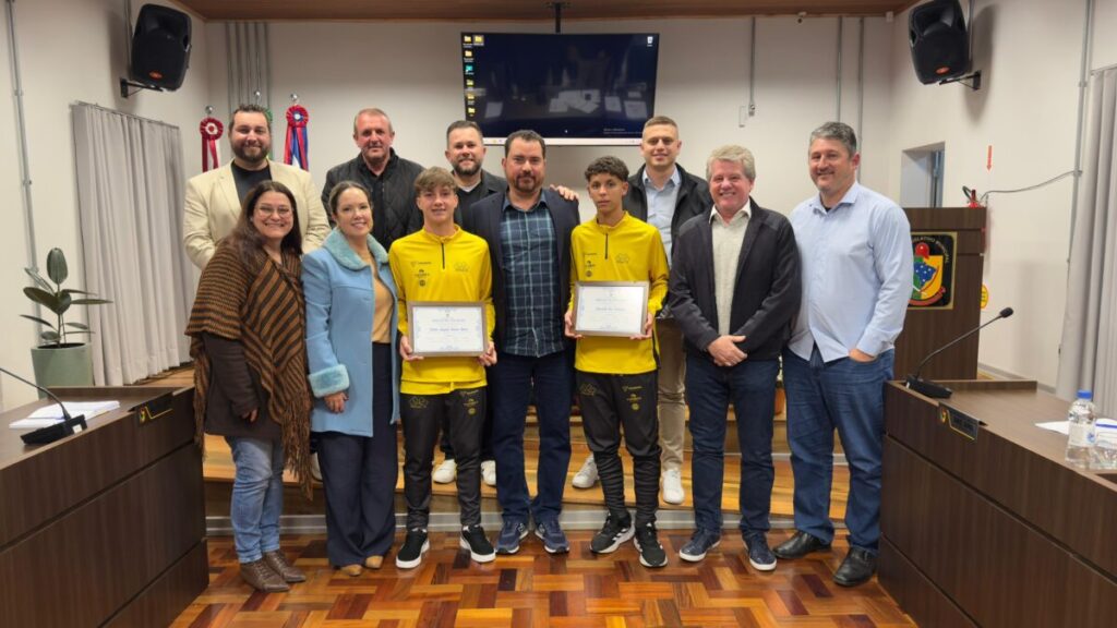 Na sessão ordinária dessa segunda-feira, dia 11, a Câmara de Vereadores de Siderópolis aprovou por unanimidade a moção de aplauso aos atletas Victor Angelo de Souza Nava, de 13 anos, e Eduardo Bez Fontana, de 14 anos. A homenagem foi proposta pelo vereador Mateus Donadel (PDT) e entregue aos jovens que têm se destacado no futebol, representando o município em competições nacionais e internacionais.