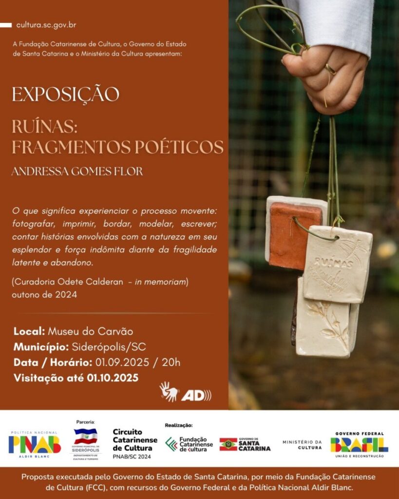 Três patrimônios tombados de Criciúma, ligados diretamente à extração mineral do Sul de Santa Catarina, vão compor a nova exposição do Museu do Carvão, no município de Siderópolis, a partir da próxima segunda-feira, dia 1º. Por meio da mostra “Ruínas: Fragmentos Poéticos”, da artista Andressa Gomes Flor, a temática será abordada por meio de diferentes expressões artísticas. A abertura ocorre na noite de segunda-feira, a partir das 20h, com entrada gratuita.