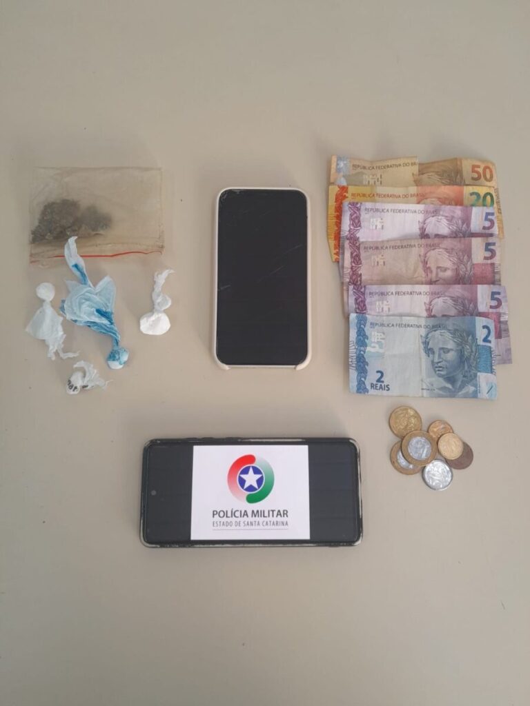 Com apoio da guarnição de Treviso, os policiais foram até o local e encontraram o suspeito, que demonstrou nervosismo diante da abordagem. Durante as buscas autorizadas pelo proprietário da casa, foram localizados 6,4 gramas de maconha, 4,1 gramas de cocaína e R$ 90 em dinheiro, além de entorpecentes no interior do veículo utilizado por ele, um Toyota Corolla.