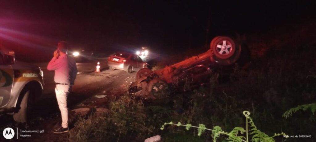 Um acidente de trânsito foi registrado na noite de quinta-feira, dia 16, por volta das 18h20, na Rodovia SC-446, no bairro Rio Fiorita, em Siderópolis. A ocorrência foi atendida pela equipe do Corpo de Bombeiros Militar de Urussanga. No local, tratava-se de uma colisão frontal entre dois veículos: um Ford Ka preto, que acabou capotando fora da rodovia, e um Ford Fiesta prata, que permaneceu às margens da pista.