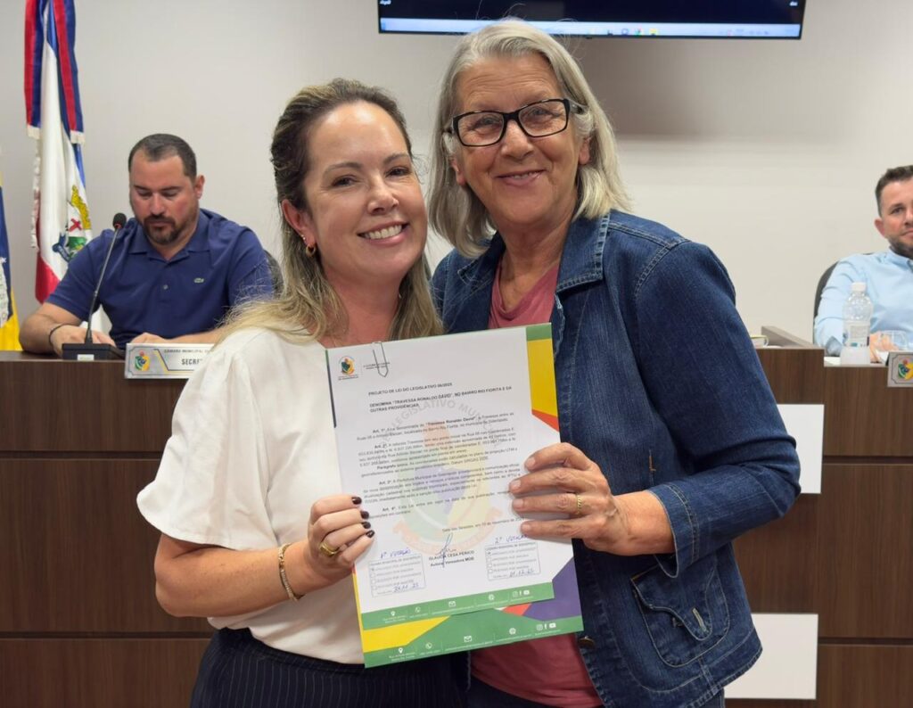 Na sessão ordinária dessa segunda-feira, dia 1º, a Câmara de Vereadores de Siderópolis aprovou por unanimidade o Projeto de Lei do Legislativo, de autoria da vereadora Gláucia Cesa Périco (MDB), que denomina “Travessa Ronaldo David” a via localizada entre a rua 08 e a rua Arlindo Barzan, no bairro Rio Fiorita.