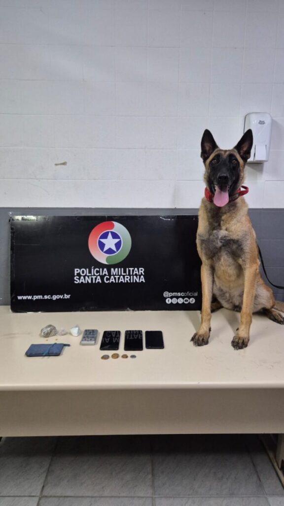 No entanto, a guarnição do Canil do 9º BPM, de Criciúma, foi acionada e, com o auxílio de um cão farejador, realizou varredura no imóvel. Foi então que os policiais localizaram, no muro lateral da residência, uma bolsa pequena de cor azul, amarrada por uma linha, contendo porções de drogas. Foram apreendidos 19,6 gramas de cocaína; 41,5 gramas de maconha e 9,2 gramas de crack.